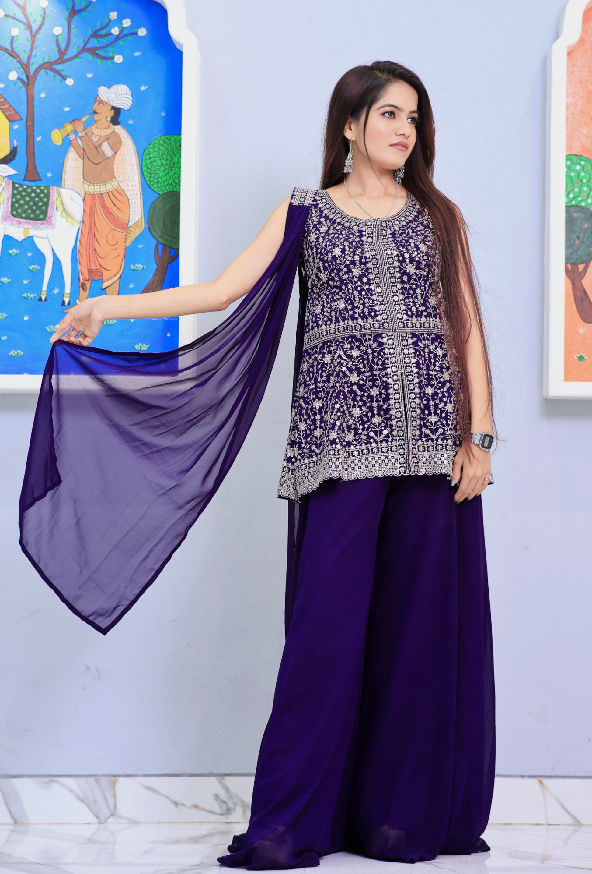 Elevate your wardrobe with this expertly crafted purple plazo set, designed for both comfort and style. The breathable fabric ensures all-day ease, while the tailored fit offers a flattering silhouette. Perfect for casual outings or festive occasions, this set combines traditional charm with modern elegance.