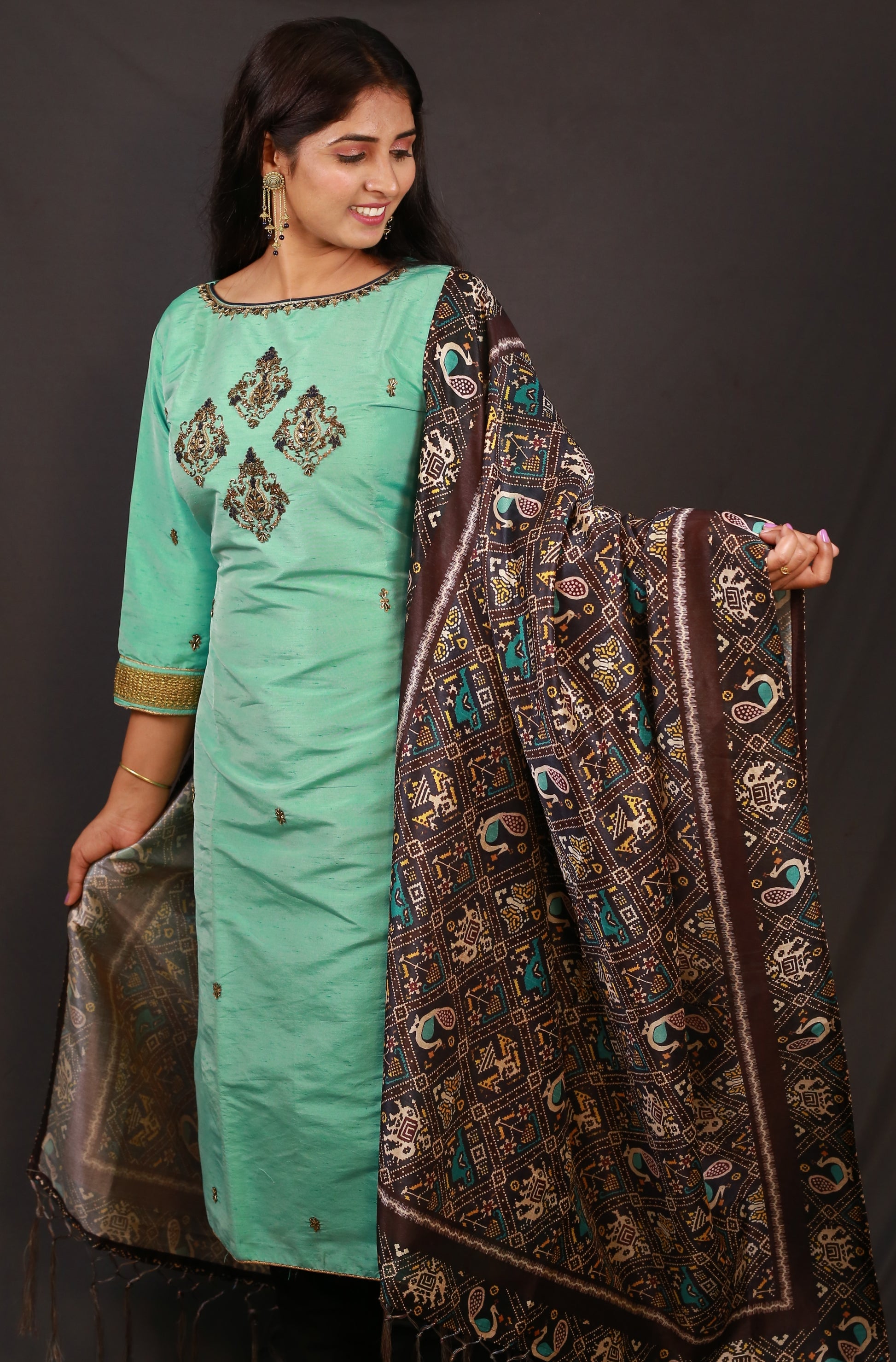 Elevate your traditional wardrobe with this elegant green Punjabi suit, paired with a distinctive Warli print dupatta. Crafted for comfort and style, the suit features a vibrant green shade that complements the intricate tribal art on the dupatta. Perfect for festive occasions or cultural events, this ensemble blends classic appeal with artistic expression, ensuring a graceful and refined look.