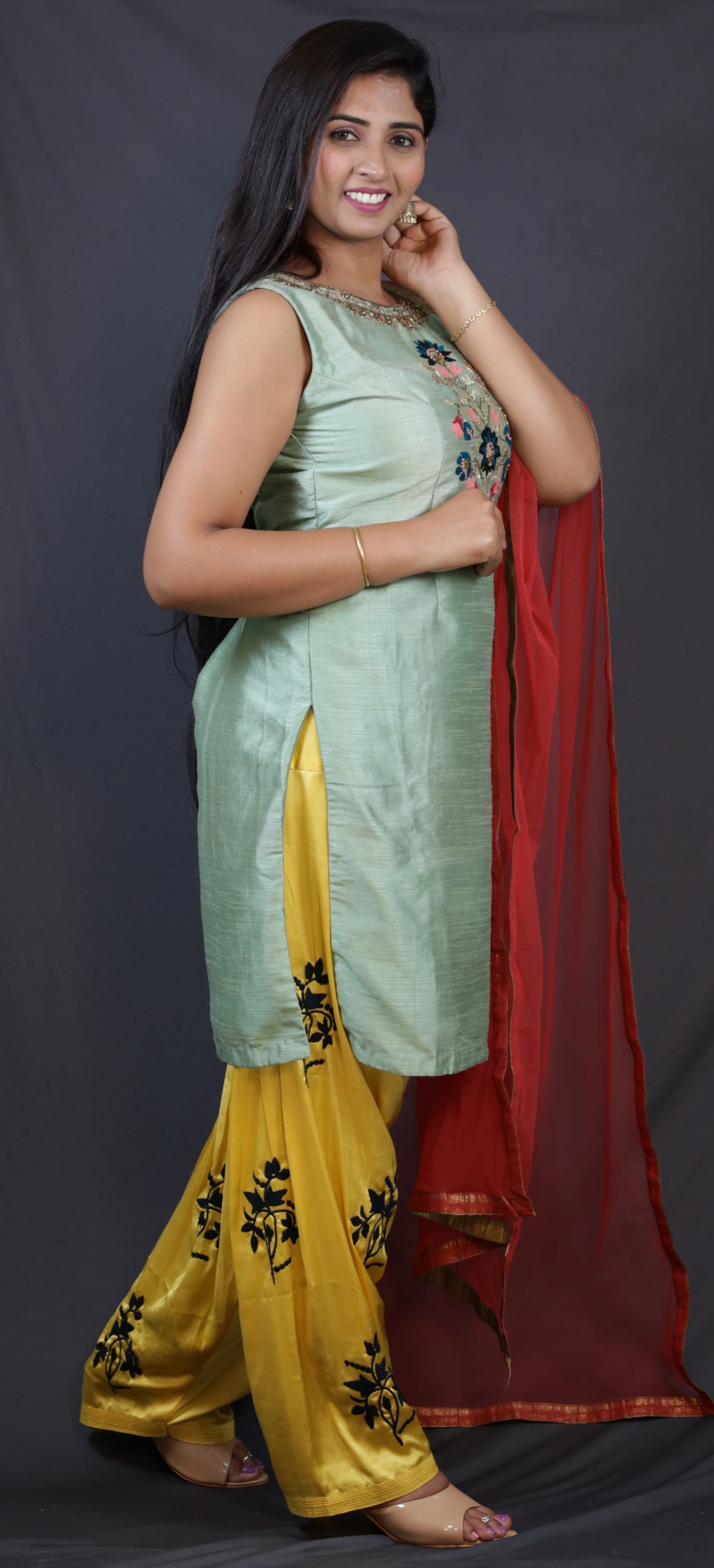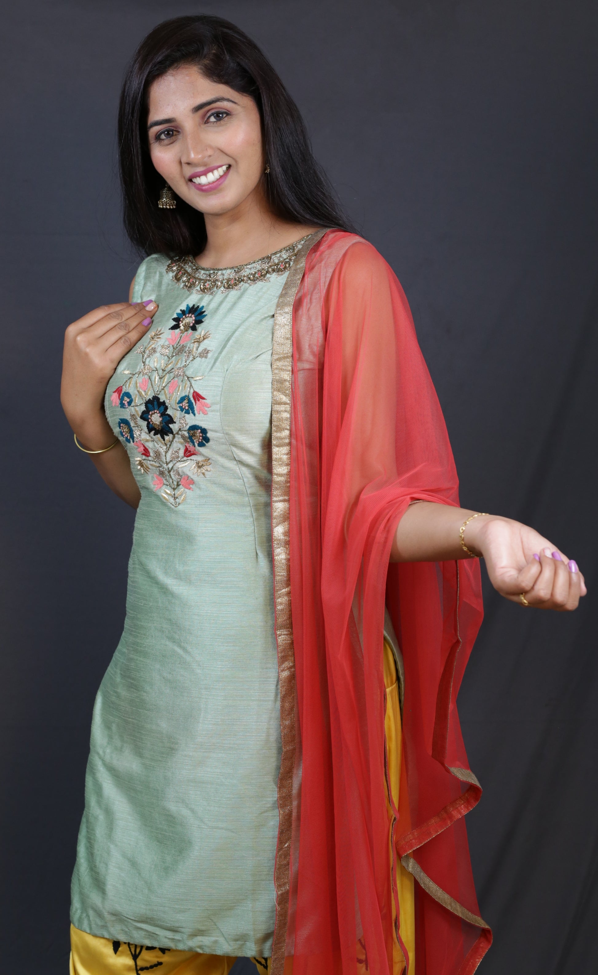 Experience the elegance of traditional craftsmanship with this Pista-colored Punjabi suit paired with a matching Patiala. The soft, refreshing hue enhances your appearance with subtle sophistication. Designed for comfort and style, this suit features breathable fabric ideal for all-day wear, while the Patiala pants offer a classic, roomy fit that allows ease of movement. Perfect for festive occasions or casual gatherings, this ensemble brings together cultural heritage and modern-day comfort seamlessly. Elevate your wardrobe with this expertly tailored Punjabi suit that reflects timeless charm.