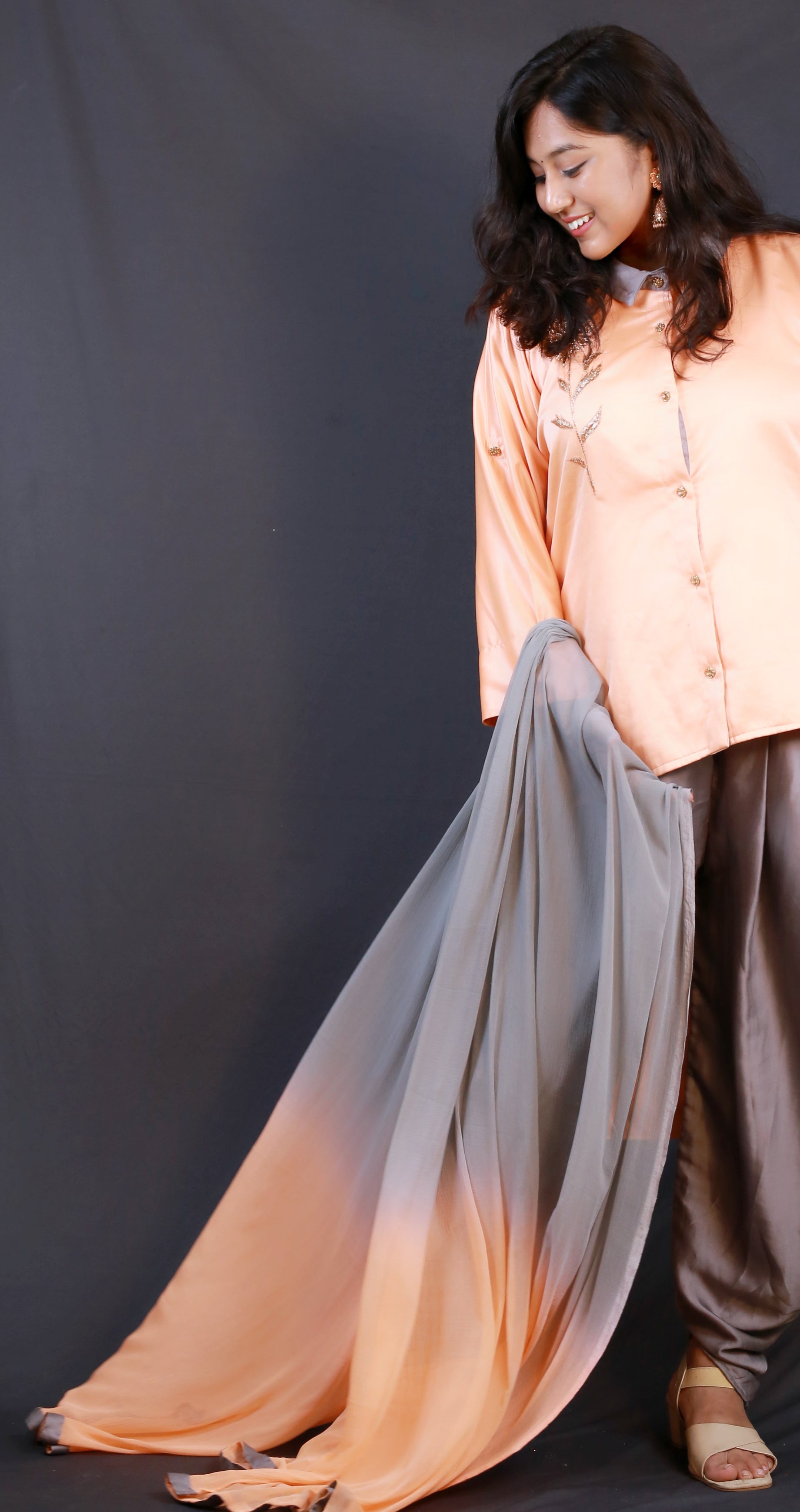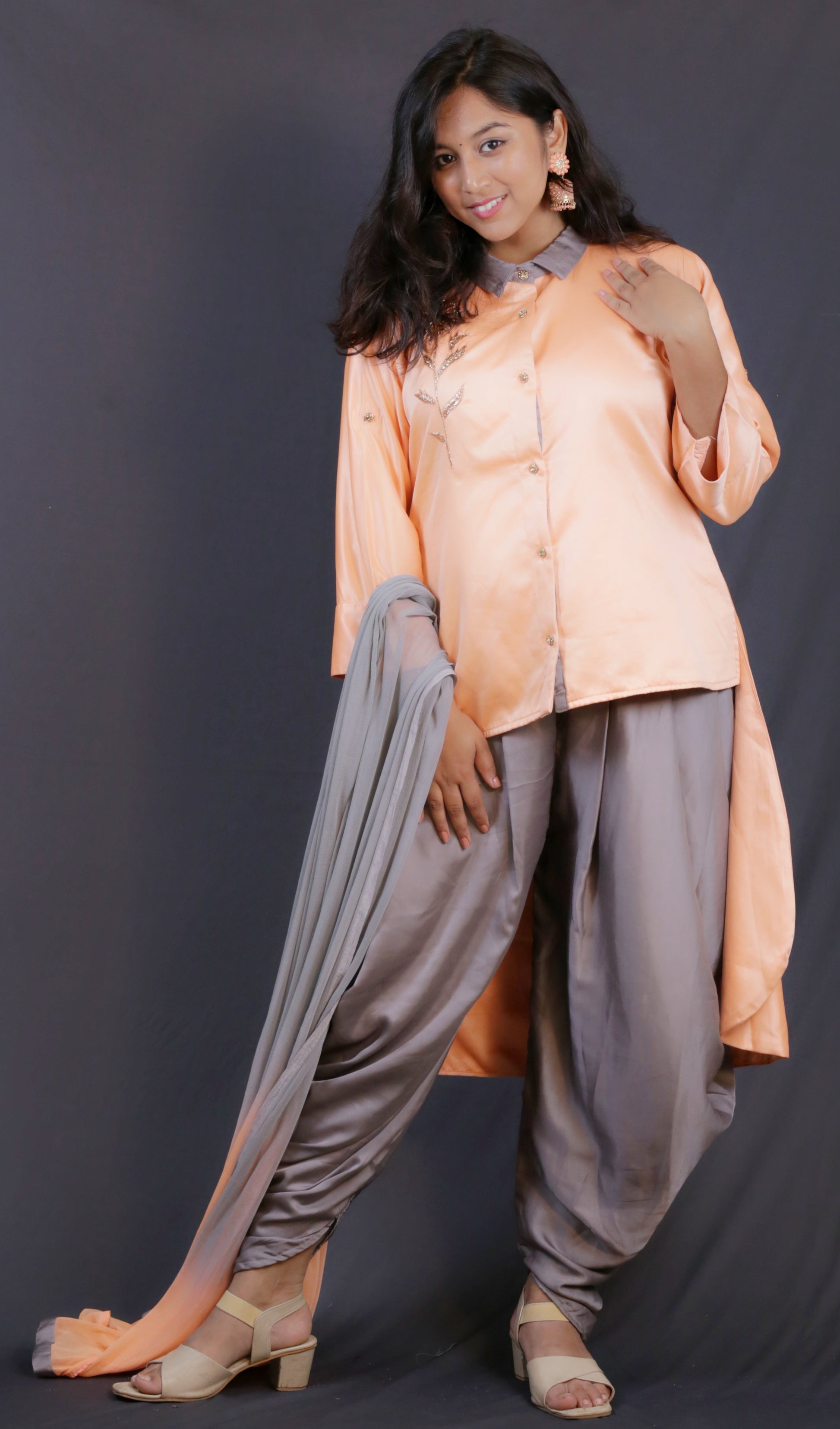 This peach-colored Punjabi suit paired with a dhoti Patiala combines traditional design with contemporary comfort. Crafted for a flattering fit, it offers ease of movement and breathability, making it ideal for festive occasions or casual wear. The soft peach hue adds a subtle elegance, while the dhoti-style Patiala enhances the outfit's unique cultural appeal.
