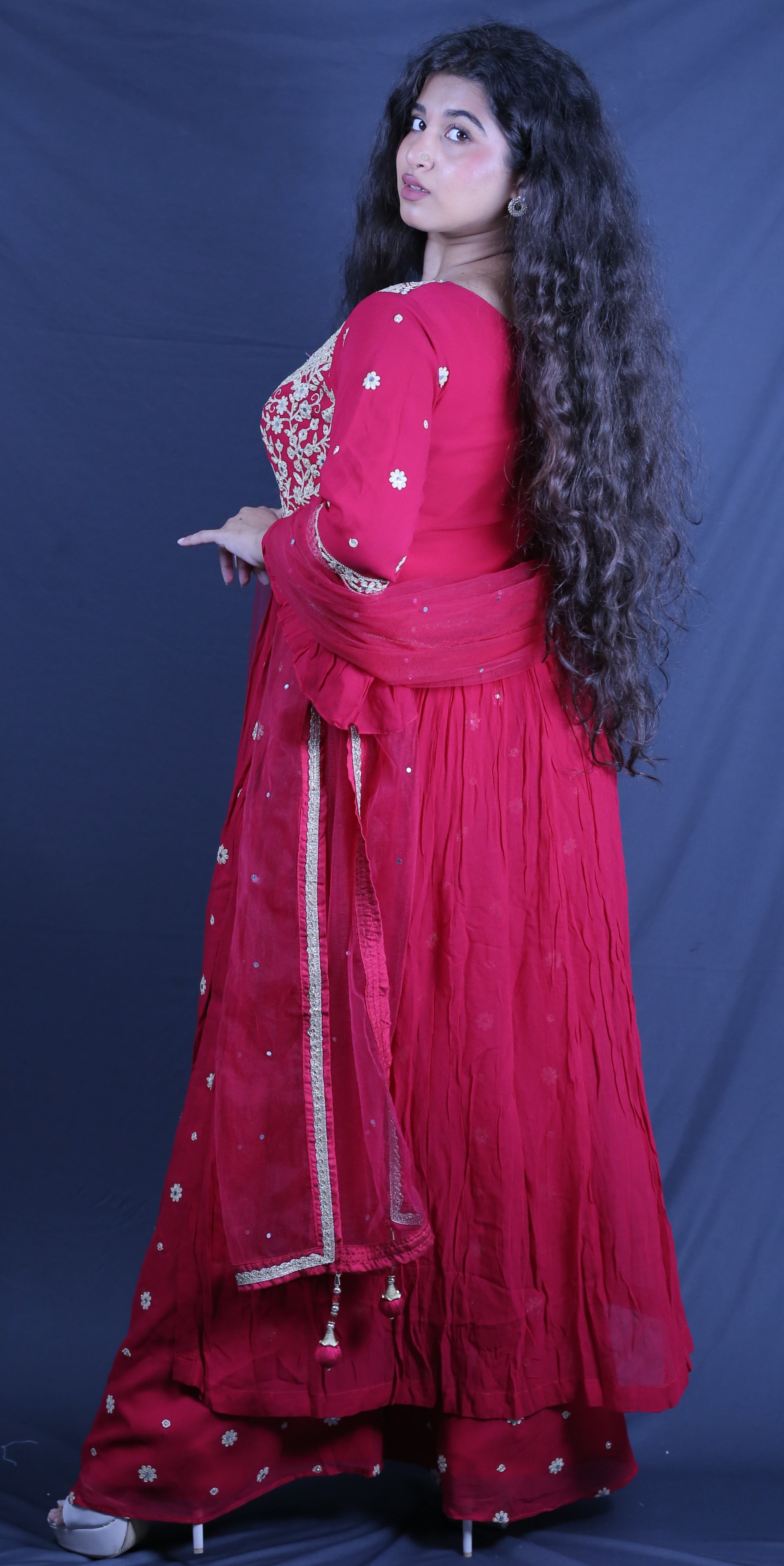 This Punjabi suit with a rani-colored gorget fabric offers a vibrant look paired with comfortable palazzo pants. Expertly crafted to combine traditional style with modern ease, it ensures both elegance and comfort for any occasion. The breathable fabric and flowing silhouette make it ideal for extended wear without compromising on style.