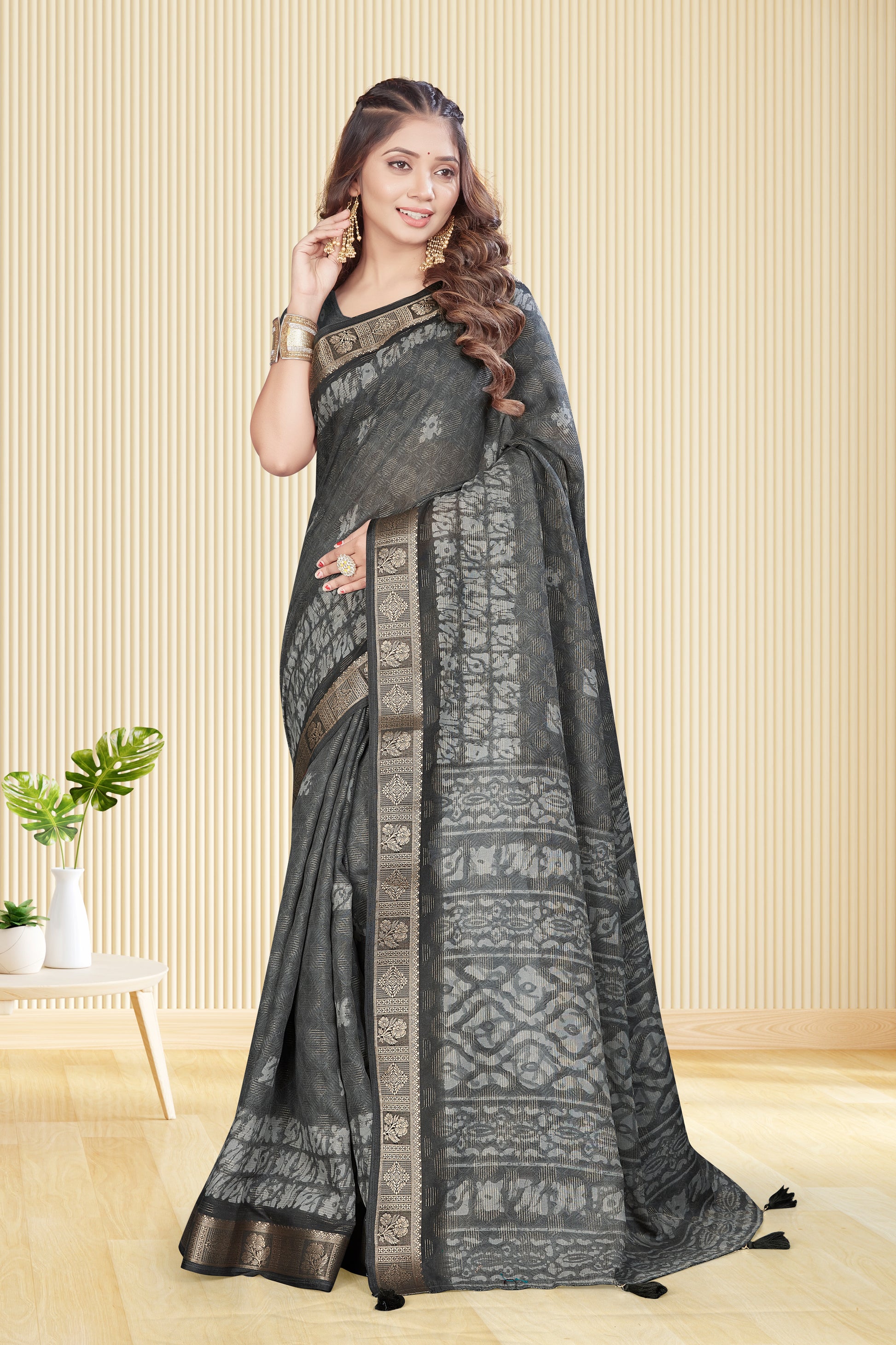 This grey synthetic saree offers a sleek and modern look with easy maintenance and durability. Its lightweight fabric ensures comfortable wear throughout the day, making it ideal for both casual and formal occasions. The subtle grey shade adds versatility, allowing effortless pairing with various accessories and blouses. Perfect for those seeking a stylish yet practical addition to their wardrobe.